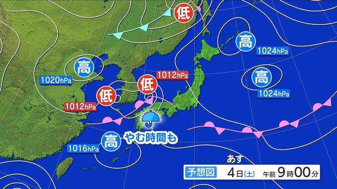 あす4日(土)は、前線を伴った低気圧の影響で、雨が降るでしょう。昼前から昼過ぎにかけて、雨脚が弱まるところもありますが、夜からまた本降りとなる見込みです。日中の気温は、各地25℃以上の夏日となり、きょうよりも5℃以上高くなるところが多いでしょう。