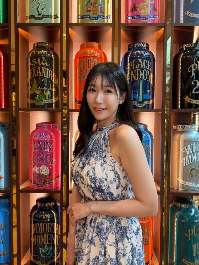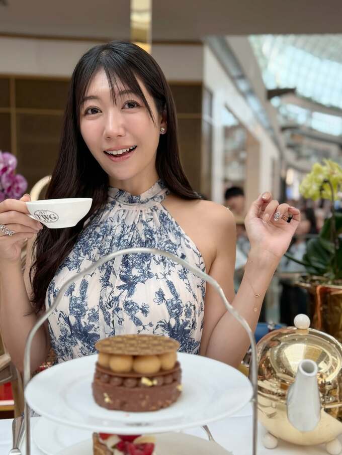 穂川さんは、白に紺のパターンが入ったホルターネックのワンピースドレスで、トレードマークのロングヘアを露出した肩にかけ、ティーカップを手に微笑む写真を投稿。穂川さんの前には、ティースタンドのトレイと思われるものがあり、その上には秋向けのモカ色をしたスイーツが鎮座していて、アフタヌーンティーの様子だと思われます。