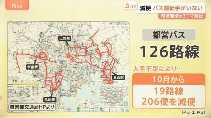 都営バスは人手不足により、10月から全126路線のうち19路線、206便を減便しました。(平日・土・休日)