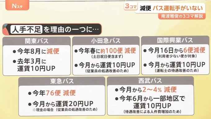 都営バス以外にも「人手不足」を理由の一つに、減便しているバス会社があります。さらに「従業員の処遇の改善」などを理由に運賃も上がるということです。