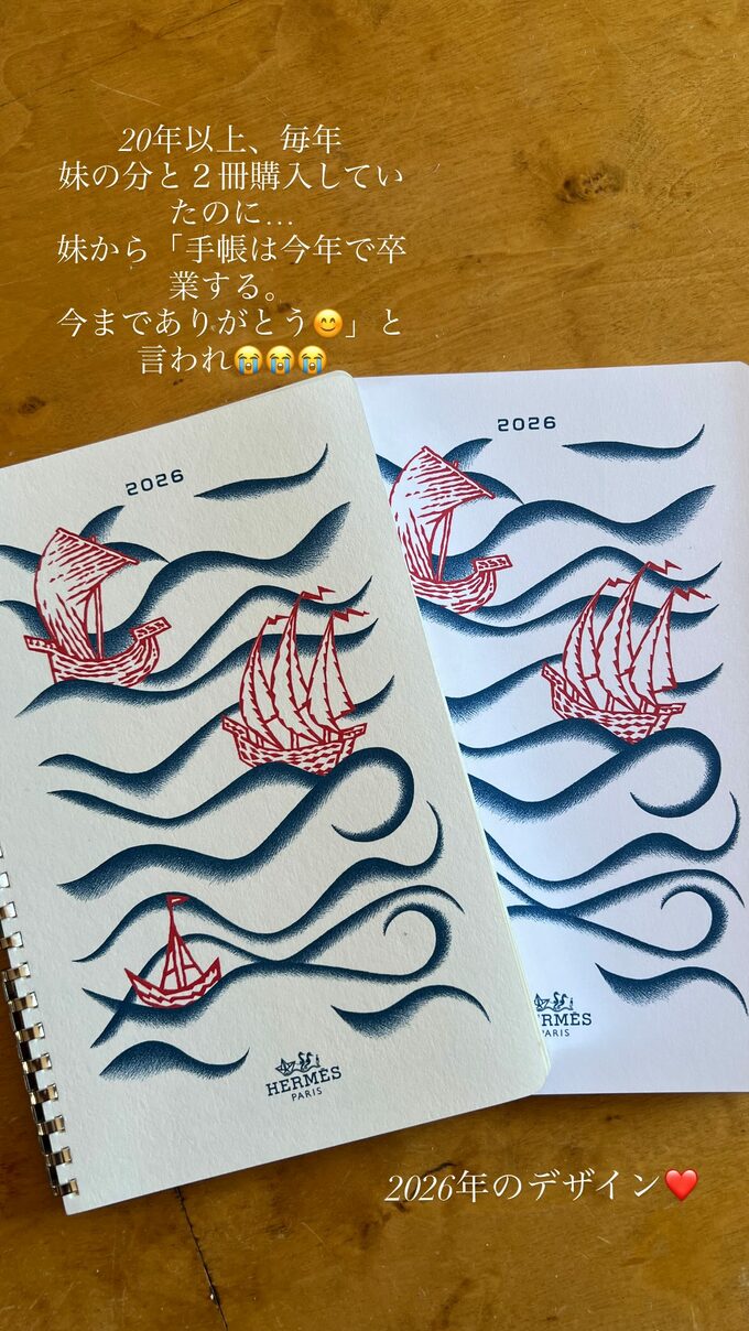 しかし続く投稿では「20年以上、毎年妹の分と2冊購入していたのに…」「妹から『手帳は今年で卒業する。今までありがとう』と言われ」と、泣き顔の絵文字を3つも並べて寂しさを表現。大海を行く船を描いた手帳の表紙が、各々の道を行く姉妹の姿に重なっています。