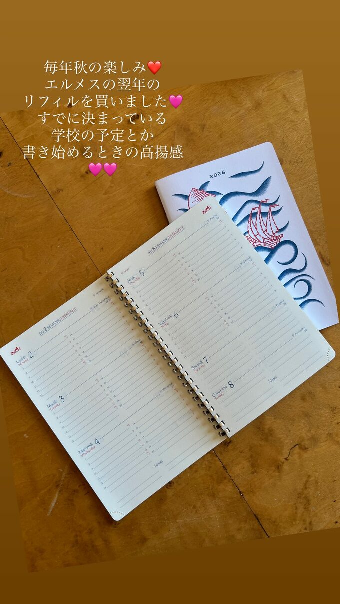 中村さんは「毎年秋の楽しみ エルメスの翌年のリフィルを買いました」と投稿。左右のページで左側が(月)(火)(水)・右側が(木)(金)(土)(日)の欄となっているスケジュール帳で、リフィルは端正な金属のリングで止められています。