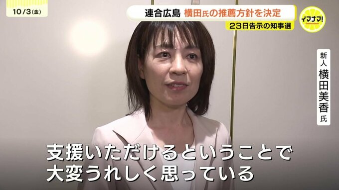 横田氏は先月末、連合広島に推薦を要請していました。橫田氏については自民党が推薦を決めたほか、公明党も推薦する方針です。