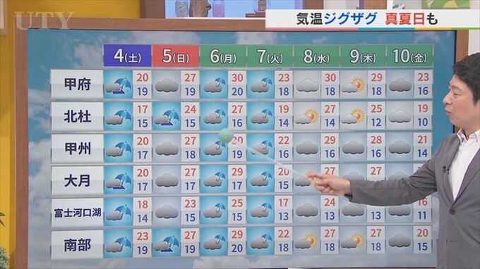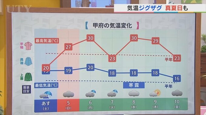 あすは20℃、あさって27℃で、来週の月曜日は30℃まで上がる予想となっています。甲府は真夏日予想。ただ火曜日はまた雨が降ることで気温がガクンと下がった後、8日の水曜日はまた30℃予想。
