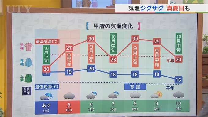 気温の変化を見ていくと、あすは10月下旬並みの気温ですが、あさっては9月下旬並みで、来週月曜日は9月上旬並みとかなり変わりやすくなりますから半袖の出番もまだありますから皆さん仕舞わないで残しておくようにお願いします。