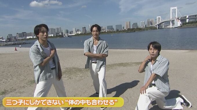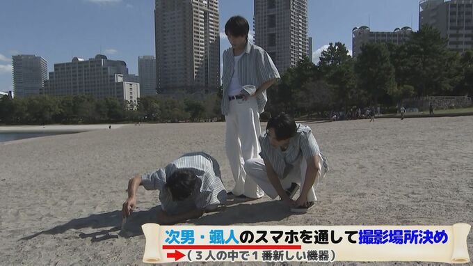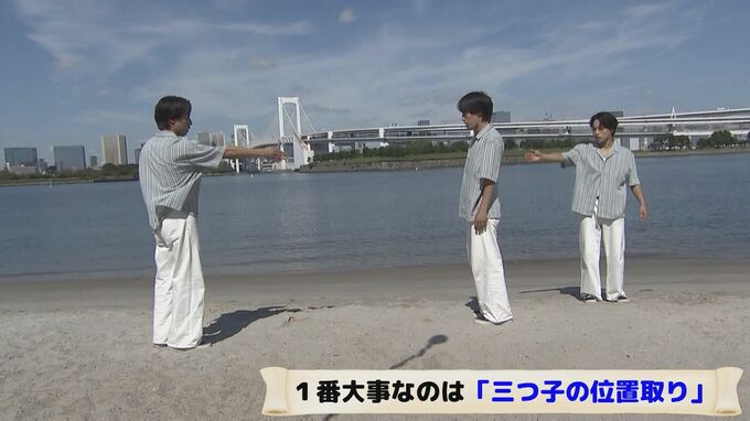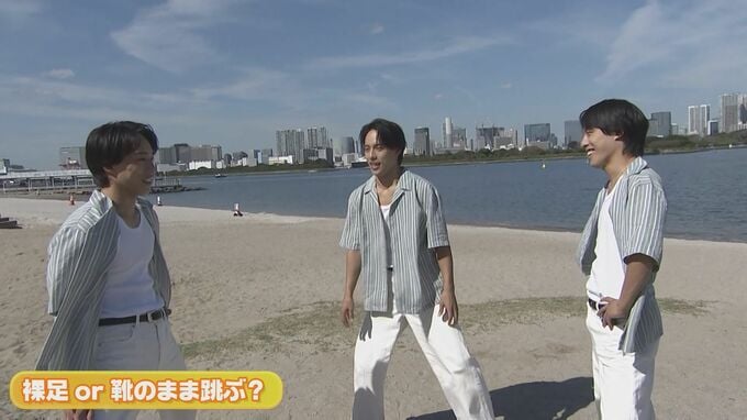 シンクロアクロバットの撮影前、3人は、「靴で撮るか、裸足で撮るか」という議論を展開。「砂浜では裸足の方がエモい」という意見に対し、「やっぱり硬いから痛い」「怪我したら意味ない」という安全面を考慮した意見も。最終的には多数決で「靴で行こう」と、決まりました。