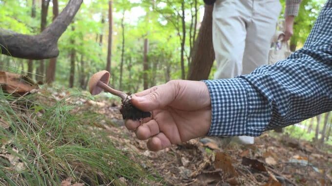 キノコ研究者の慶応義塾大学・糟谷大河(かすや・たいが)准教授と森の中を歩いて、キノコを採取。