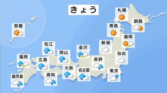 全国のきょうの天気です。 西日本から東日本は、広く雨が降るでしょう。局地的に雷を伴って激しく降り、大雨となるところもありそうです。土砂災害や低い土地の浸水などに警戒が必要です。関東や東北南部は、午後…