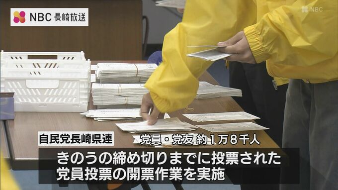 自民党長崎県連では、党員・党友およそ1万8千人が投票権を持っていて、3日の締め切りまでに投票された党員投票の開票作業が、午前9時半から行われました。