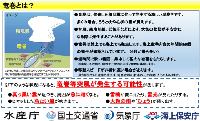 また気象庁は、日本において「2007~2024年を平均した1年当たりの竜巻発生確認数は、海上竜巻を含めた竜巻全体では約51件、海上竜巻を除けば約20件となっています」としています。
