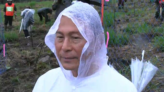 雨の中、地元のボランティア約200人も参加し、イロハモミジやヤマザクラなど5種類の木の苗約1400本を植えました。