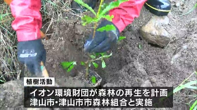 かつてスキー場や牧場として利用されていた土地に5年計画で森を再生しようと、イオン環境財団が津山市や市の森林組合と共同で植樹を実施しました。