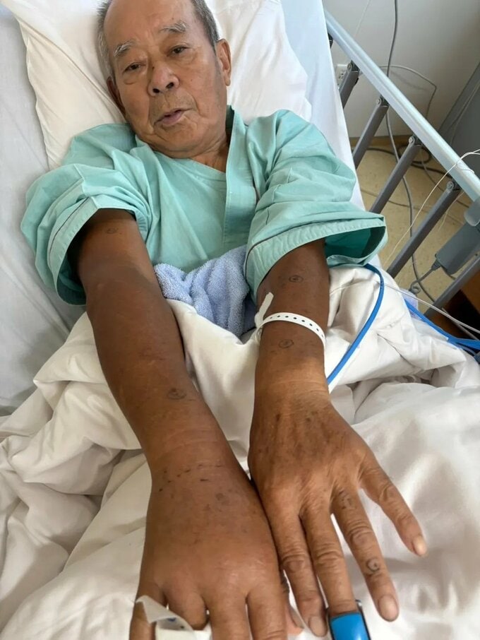 チェリー吉武さんは、「父上がマムシに噛まれ入院したみたいです。」と投稿。「昔からマムシ退治は得意でしたが 今回は不意を突かれ、紐だと思ったらマムシの尻尾だったと。」その経緯を綴り、病院のベッドに横になる父親の画像を投稿しました。