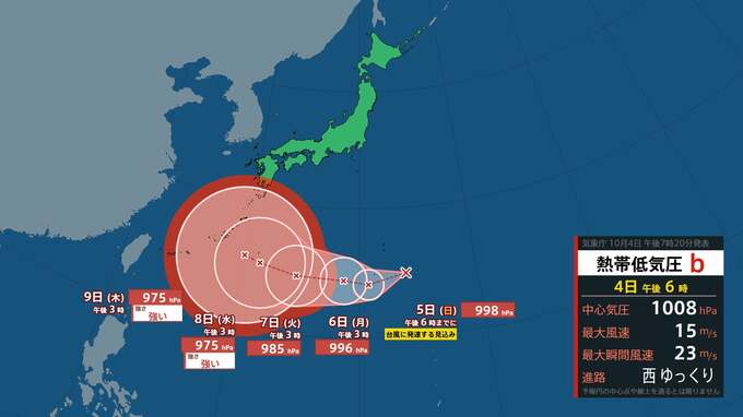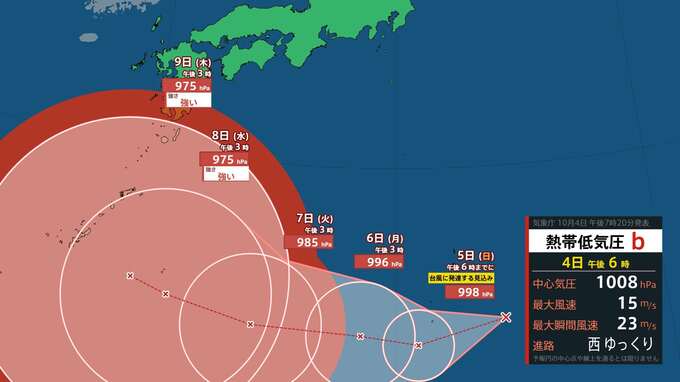 気象庁によりますと、熱帯低気圧は4日午後3時現在、小笠原近海をゆっくりとした速さで西へ進んでいます。中心気圧は1008hPa、中心付近の最大風速は15m/s、最大瞬間風速は23m/sとなっています。