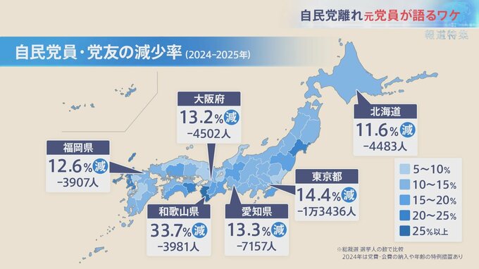 都道府県別では、東京が1万人以上と最も減っていて、愛知でも7000人ほど減少。2024年に政界を引退した二階幹事長の地元・和歌山では約3割と大幅だった。全ての都道府県で党員が減少している。