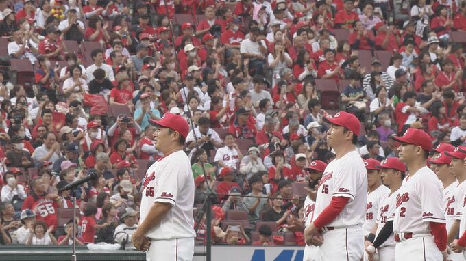 挨拶の後、新井監督からの"無茶ぶり"で、この日がカープでの最後のプレーとなった田中広輔と松山竜平も、ファンへのスピーチを行った。
