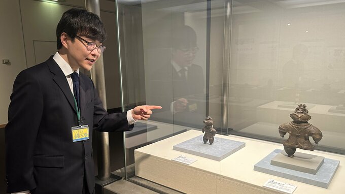 (東北史博物館 山田凜太郎学芸員)これらの土偶は、約1万年ある縄文時代の終わりの時期の、東北地方から出土する土偶で、特徴は大きな目です。北方民族がつけている「遮光器」という眼鏡に似てるから「遮光器土偶」と名付けられました。中は空洞になっています。土偶の中でも数が少ないです。