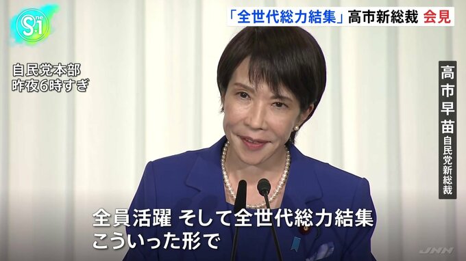 新しい自民党総裁に選ばれた高市早苗氏は、「全世代総力結集で取り組む」と、党再生への意欲を語りました。高市早苗 自民党新総裁「全員活躍。そして全世代総力結集。こういった形で、みんなで力を合わせて取り組…