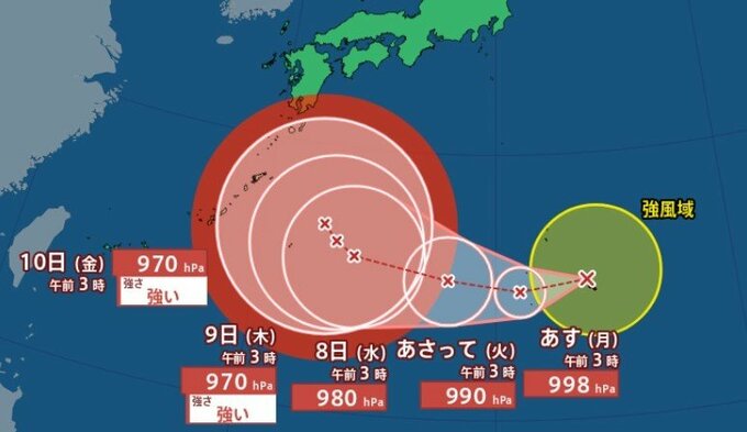 ▼7日午前3時には「日本の南」に進み、中心気圧は990hPaまで低下、中心付近の最大風速は25m/s、最大瞬間風速は35m/sに強まる見込みです。