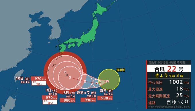 気象庁によりますと、台風22号は、中心気圧が1002hPa、中心付近の最大風速は18m/s、最大瞬間風速は25m/sとなっています。強風域は北東側に330km、南西側に220kmに達しています。