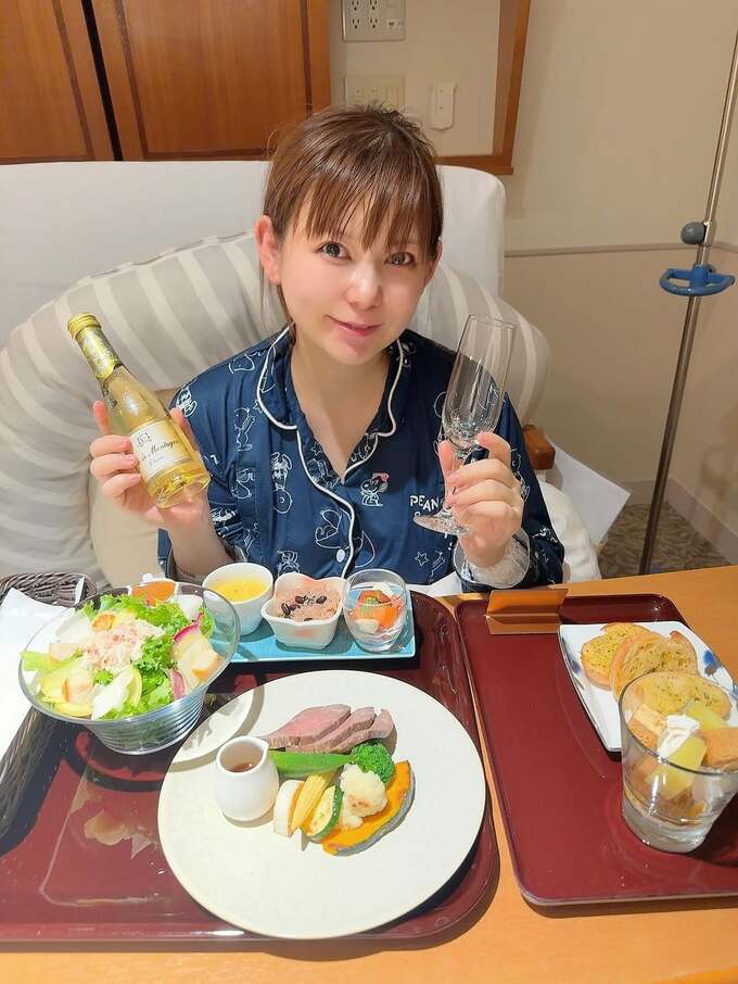 中川翔子さんは「病院のお祝い膳に感動、ローストビーフ!!かにサラダ!シャンパンみたいなぶどうジュース!」と、食事を楽しむ画像をアップ。