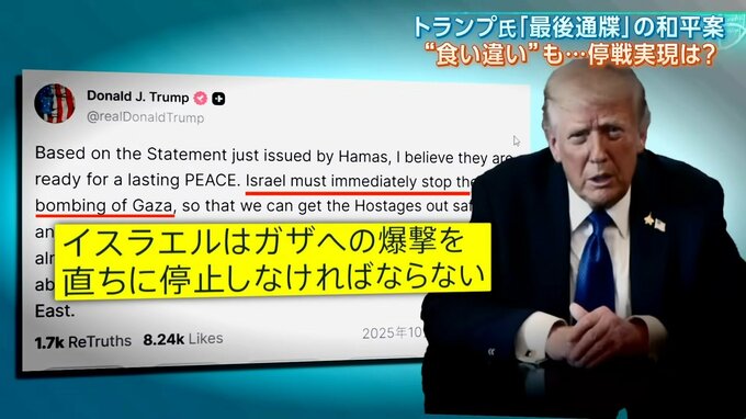 イスラエルのネタニヤフ首相は、その場で受け入れを表明。一方、ハマス側の回答が遅れる中で、トランプ氏は“最後通牒”も突きつけます。