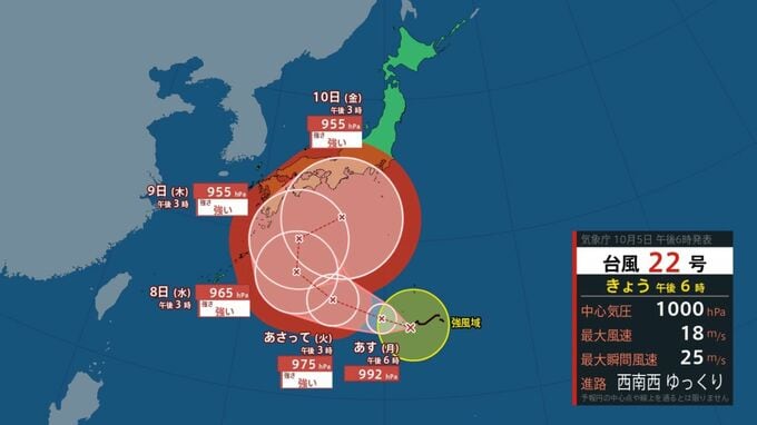 台風22号は、きょう午後6時には父島の南約300キロのにあって、ゆっくりした速さで西南西へ進んでいます。