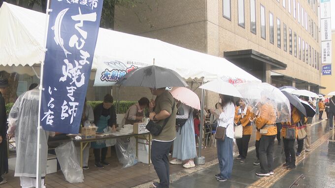 地元の観光物産協会認定の「さんま焼き師」たちが炭火で焼き上げた香ばしい香りに大勢の人が引き寄せられていました。