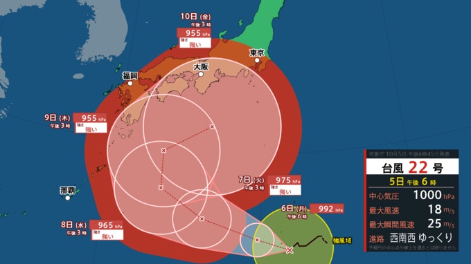 【台風情報】「台風22号」急カーブして日本列島沿岸部を西から東へ 予報円内に九州・四国・近畿・東海・関東地方も 今後の進路は?【6日午前0時45分発表 10月5日~10月21日までの16日間天気シミュレーション 気象庁発表】|TBS NEWS DIG