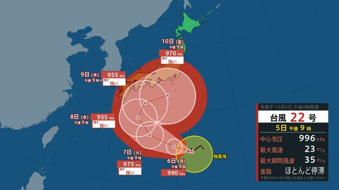 台風22号は、きょう午後9時には父島の南約300キロのにあって、ほとんど停滞しています。