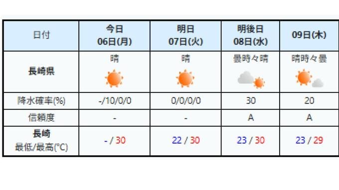 「晴」降水確率0% 最低22℃/最高30℃予想