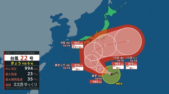 気象庁によりますと、台風22号はきょう(6日)午前6時には、父島の南約250キロにあって、ゆっくりした速さで北北西へ進んでいます。