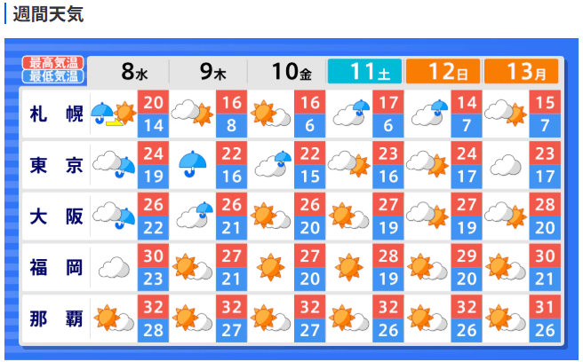 台風22号情報 急激な右カーブで日本列島に触れるように移動か 関東地方に向かう可能性も 最大瞬間風速60メートルまで発達予想 気象庁データで今後の進路と勢力を詳しく 全国主要都市週間天気も テレビユー山形 2025年10月6日(月) 08:44 国内 ■全国の週間天気(画像)