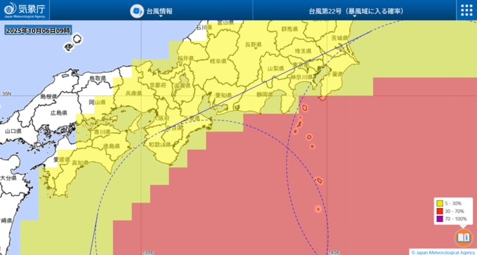 台風22号は、8日から9日にかけて東寄りの進路に変わり、東日本に影響をおよぼす可能性があります。四国、近畿、東海、関東甲信の広い範囲が、風速15m以上の強風域に入る可能性が5~30%、伊豆諸島や関東の一部が風速25m以上の暴風域に入る確率は、30%~70%です。