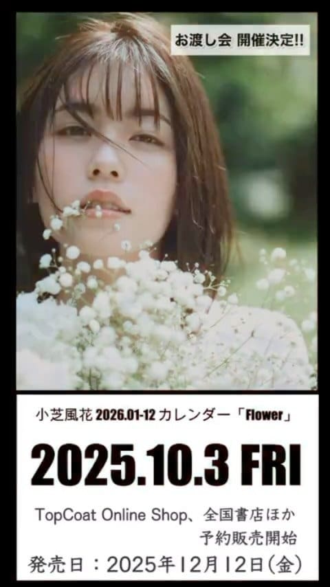 小芝さんは、「お知らせです」と書き出し、「この度、2026年カレンダー『Flower』を発売させて頂くことになりました」と発表。「発売は12月12日(金)なのですが、本日から予約受付を開始いたしますっ!」と予約の受付が始まったことを明かしました。