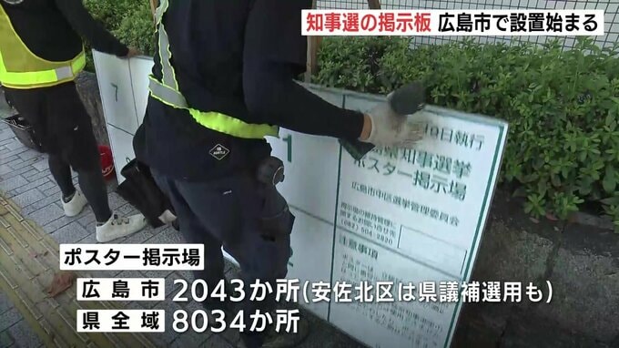 広島市中区の国泰寺公園では、6日午前9時から知事選の立候補者のポスターを貼る掲示板が設置されました。広島市では6日から21日までに2043か所。県全域では8034か所に設置される予定です。