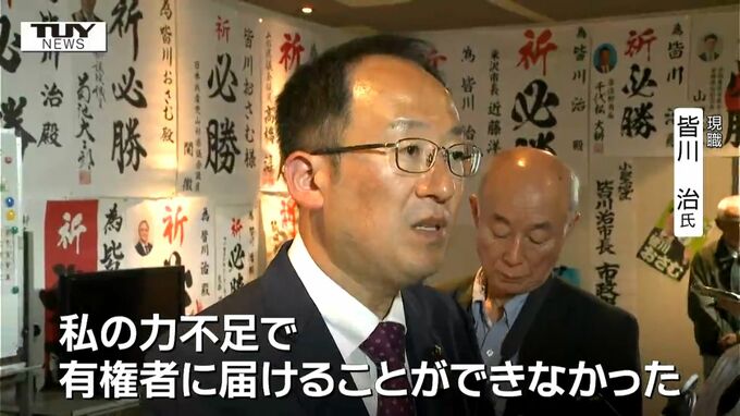現職 皆川治 氏「対話の市政ということを訴えてきましたので、正攻法でやった訳だが、有権者の方々、やはり必ずしも政策を見ていくという訳でもありませんし、私の力不足で有権者に届けることができなかった」