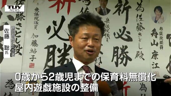 鶴岡市長に初当選 佐藤聡 氏「0歳から2歳児までの保育料無償化、屋内遊戯施設の整備。この住み慣れた場所に皆さんが安心して住み続けられる。そんな街づくりをしっかりと進めていきたい」