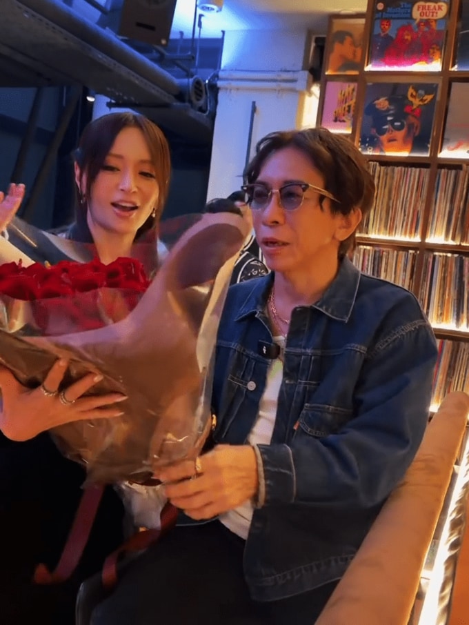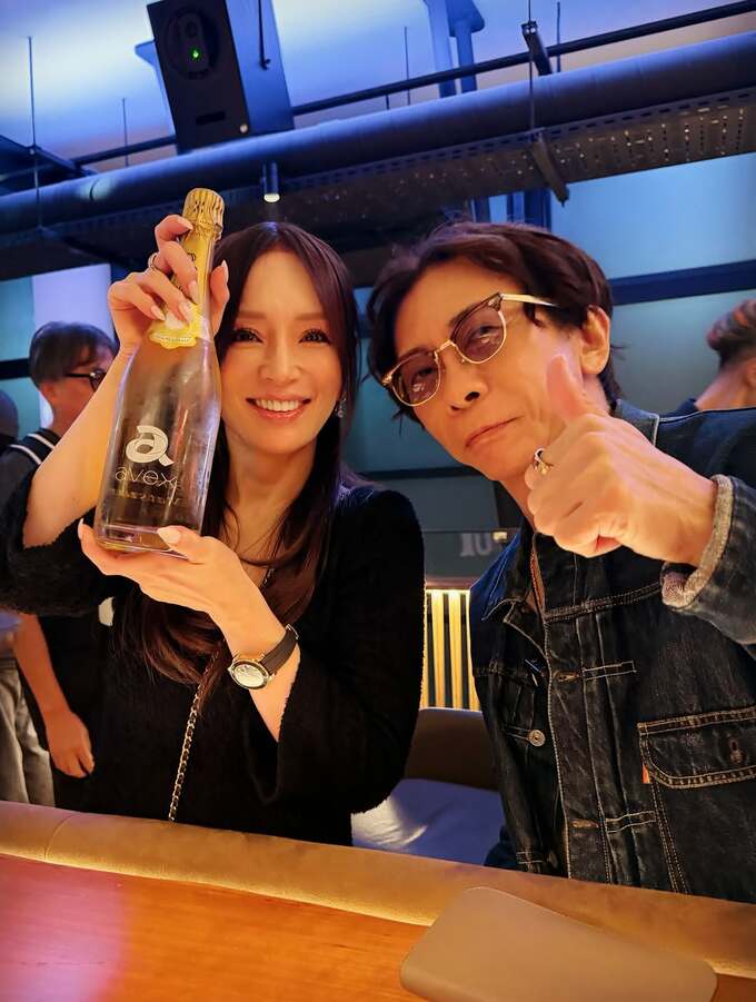 投稿された画像では、「エイベックス」の松浦勝人会長に、浜崎あゆみさんが花束を渡し、笑顔を浮かべる様子が見て取れます。