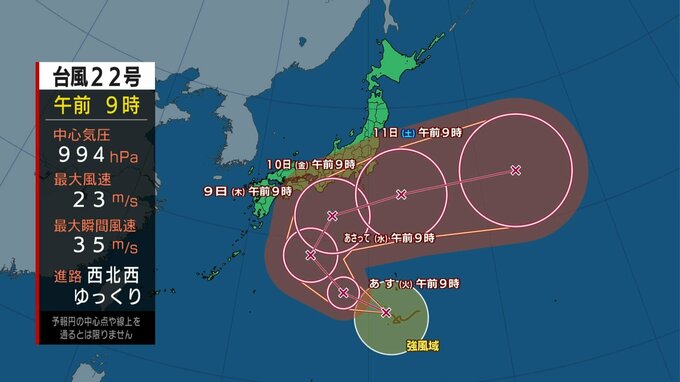 木曜日頃は台風22号が関東や東海の南の海上に進み、伊豆諸島では大荒れの天気になります。台風本体の活発な雨雲が本州の陸地にかかるか、かからないかで、影響が大きく変わってきます。進路がまだしっかりと定まっていないため、今後も最新の情報をご確認ください。