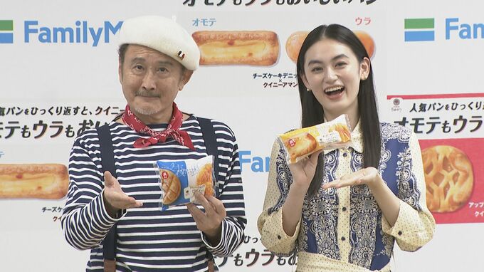 俳優の吉田鋼太郎さん、八木莉可子さんが、ファミリーマート「オモテもウラもおいしいパン」発表会に登壇しました。