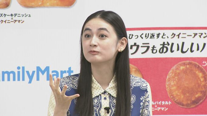 新商品「チーズケーキデニッシュ×クイニーアマン」を一口頬張ると、“うん!うんまーい!”と、満面の笑み。“チーズケーキでありながらパンでもありクイニーアマンで、もう、どうお伝えできましょう!”と、大きく身振り手振りを交えて美味しさを伝えました。