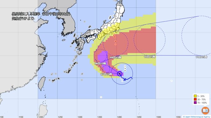 気象庁が発表している「暴風域に入る確率」では、九州地方・四国地方は「5%~30%」の確率の地域から外れていますが、近畿・東海・関東地方などで、暴風域に入る可能性「5%~30%」を示す黄色(画像参照)が広がっています。今後も最新の気象情報に注意が必要です。