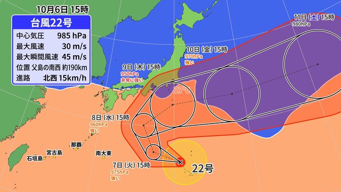 台風22号は、8日(木)ごろに北寄りに進路を変える予想です。その後、予報円の中心はきのう5日までの予想よりも東寄りの進路を取ると予想されています。