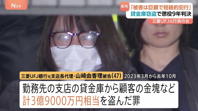 三菱UFJ銀行の貸金庫から客の金塊などを盗んだ罪に問われている元行員の女に対し、東京地裁は懲役9年の実刑判決を言い渡しました。三菱UFJ銀行の元支店長代理・山崎由香理被告(47)は、勤務先の支店の貸金庫から…