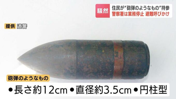 砲弾のようなものは長さ約12センチ、直径約3.5センチの円柱型で、約4時間後に陸上自衛隊が回収、避難の呼びかけも解除され、けが人もいません。