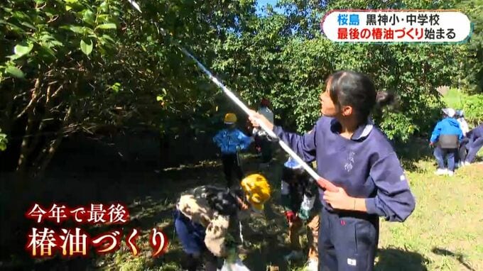 今年度で閉校が決まっている桜島の黒神小・中学校で最後の椿油作りが始まりました。きょう6日は、地域の人たちと協力して椿の実を収穫しました。全校児童2人の黒神小学校と全校生徒2人の黒神中学校ではおよそ50年…