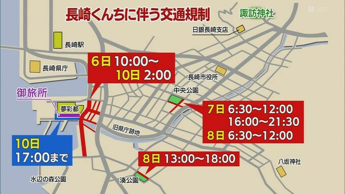 7日と8日は中央公園と湊公園周辺の道路も規制されます。長崎市元船町の「おくんち広場」周辺の道路は10日まで歩行者専用となります。
