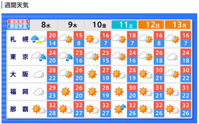 台風22号情報(ハーロン)関東地方に接近、非常に強い台風になり最大瞬間風速65メートルに 気象庁発表データで今後の進路と勢力を詳しく 全国主要都市の週間天気は テレビユー山形 2025年10月6日(月) 18:27 国内 ■全国主要都市の週間天気予報