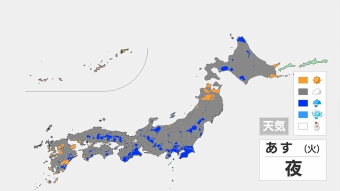 あすも前線が東海道沖付近までのびて停滞するため、太平洋側を中心に雲が広がりやすくなりそうです。朝は近畿や東海・関東甲信で雲が広がり、雨が降るところもあるでしょう。昼過ぎには、雨が降りやすい範囲が四国や北海道の一部にも広がる見込みです。夜になると、全国的に曇りや雨となりそうです。